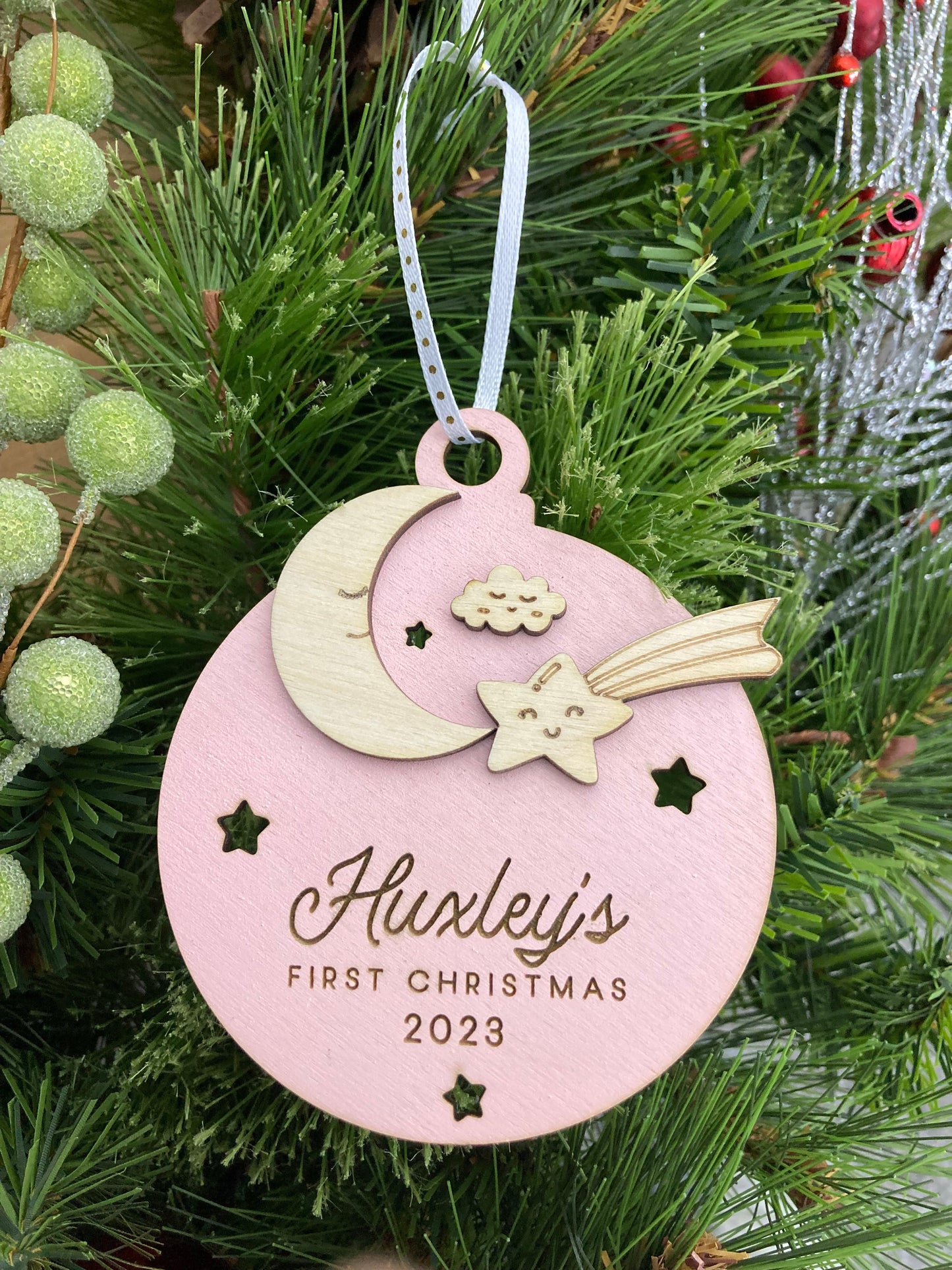Personalized Baby's First Christmas Ornament | Laser Engraved Wood Ornament | Nursery Gift | Moon and Stars | Christmas Keepsake Ornament | Holiday Gift