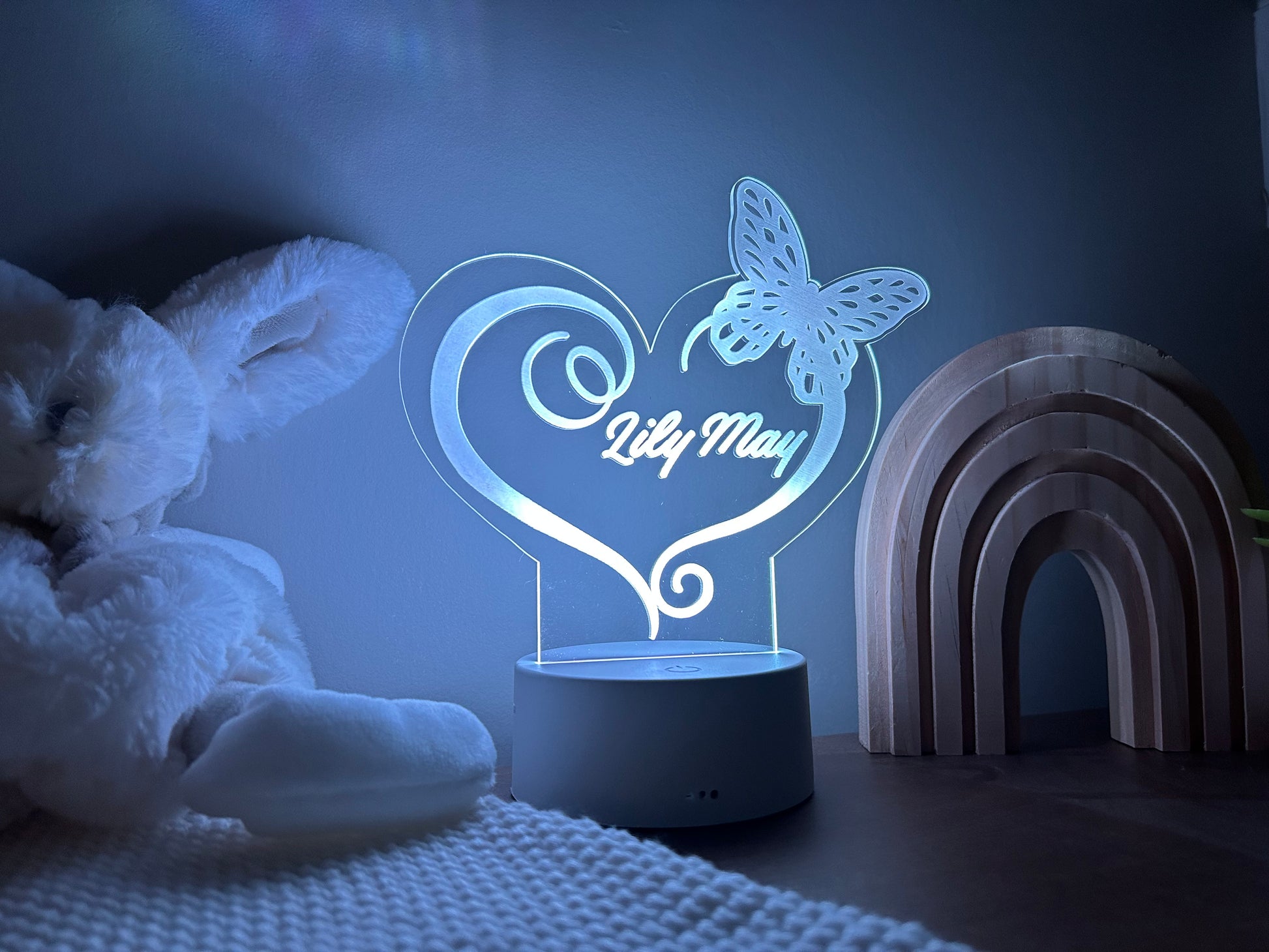 Personalized Acrylic Heart and Butterfly Night Light | LED Night Light | Nursery | Kids Room | Baby Shower Gift