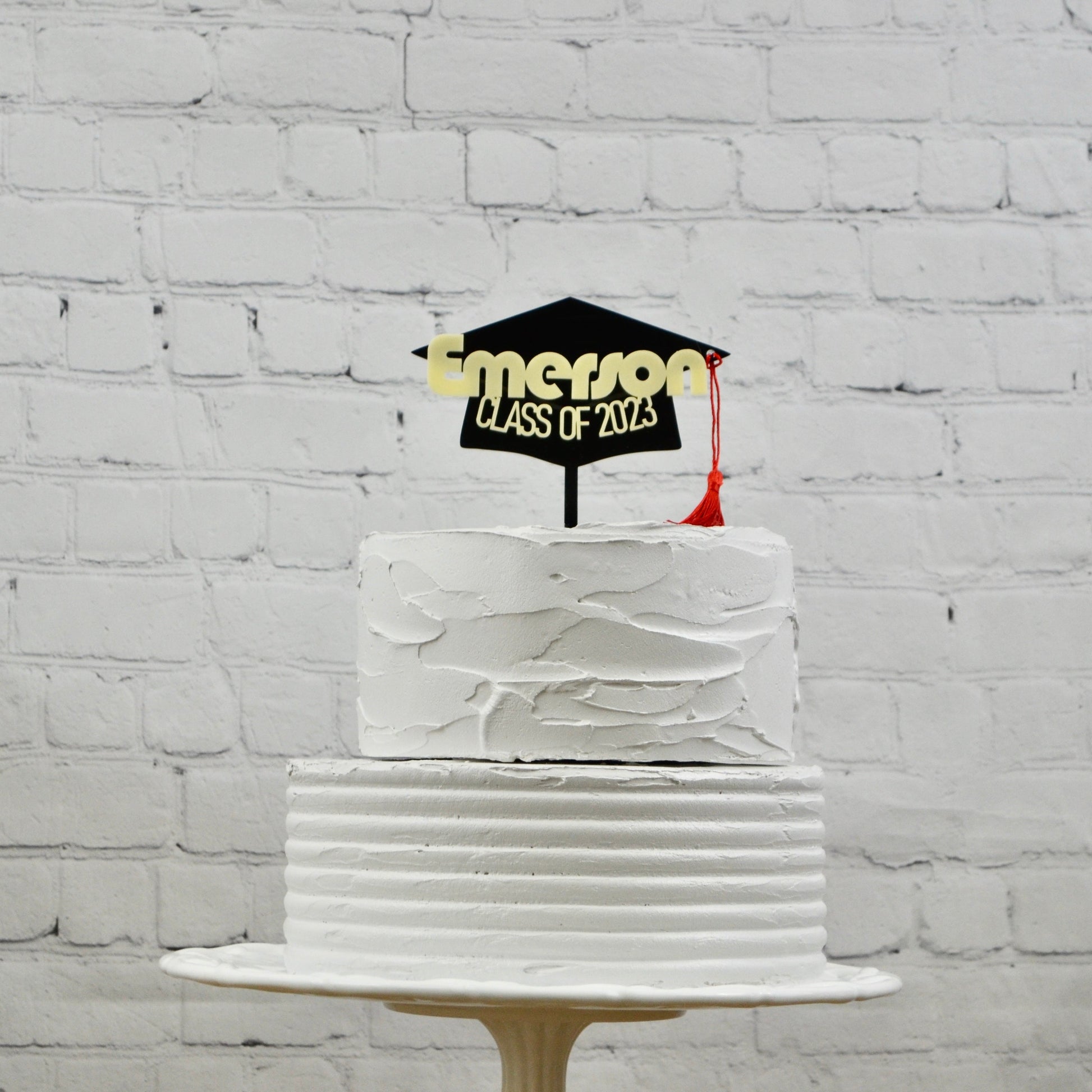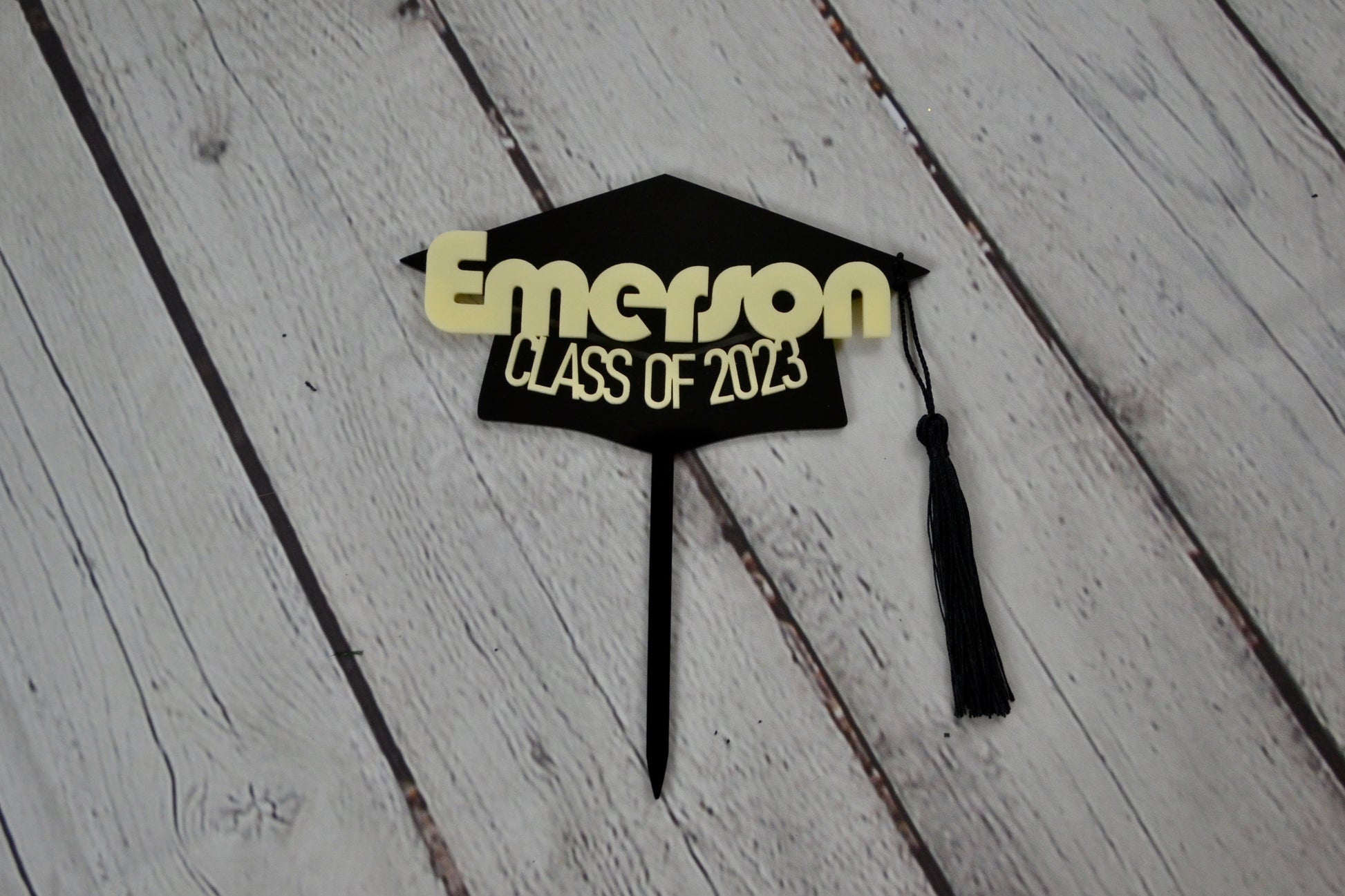 Our base layer is cut from black (gloss) high-quality acrylic; the graduate's name and year can be precision cut from a variety of colors, allowing you to coordinate seamlessly with your graduation theme. The laser engraved detailing is flawless, creating a stunning focal point for your cake that will impress your guests, make for stunning photos and is a timeless keepsake that will be cherished for years to come.