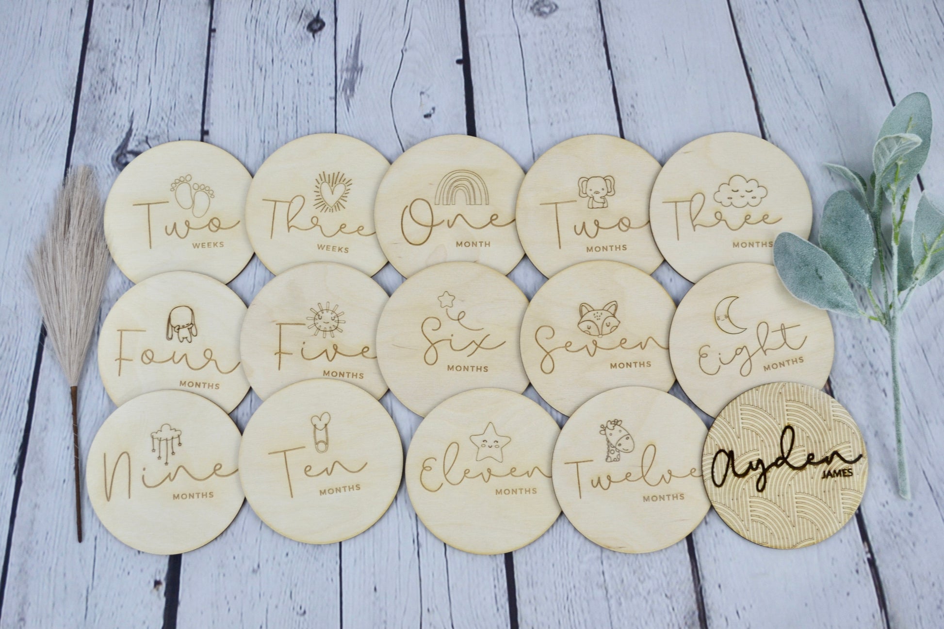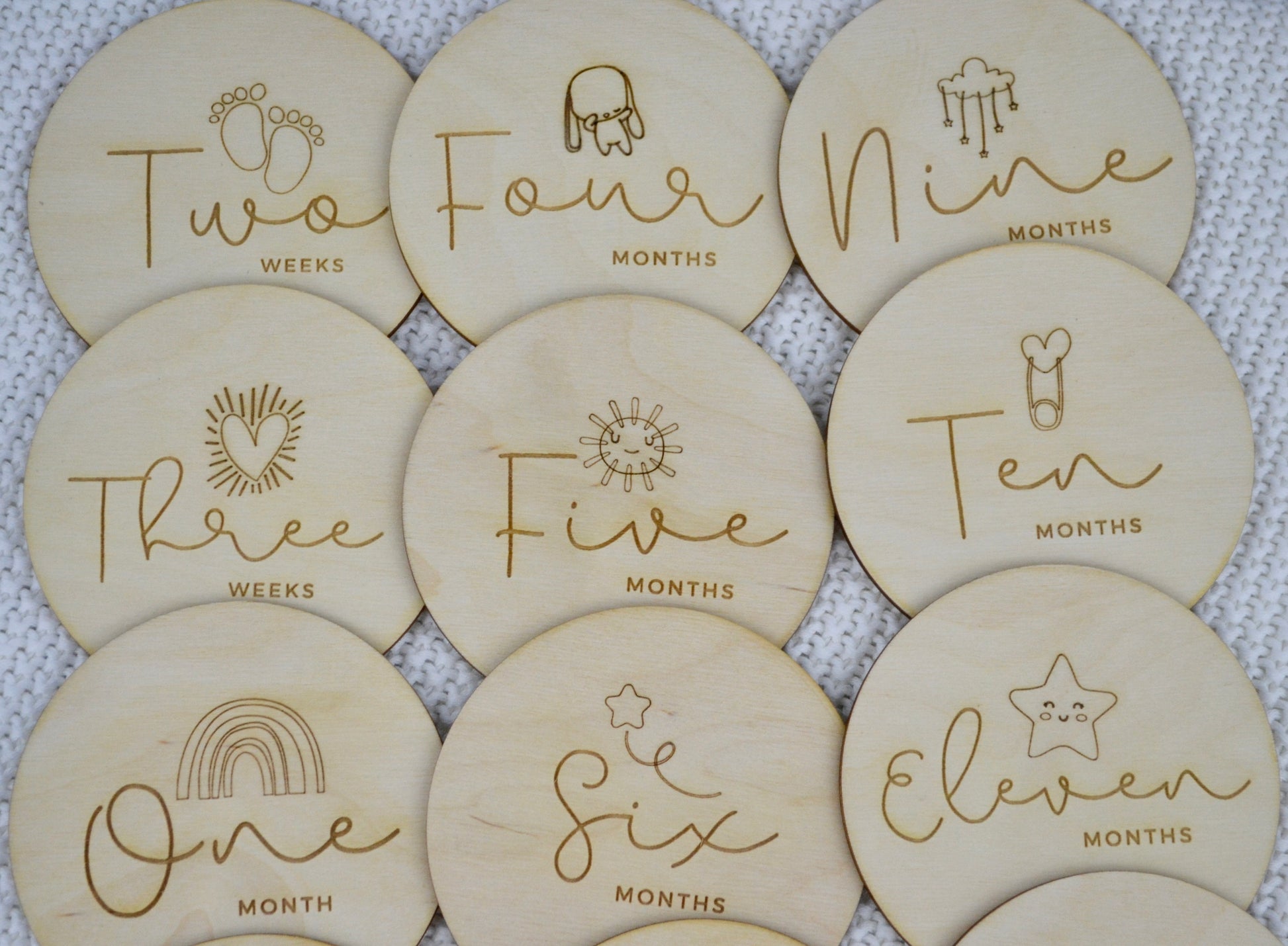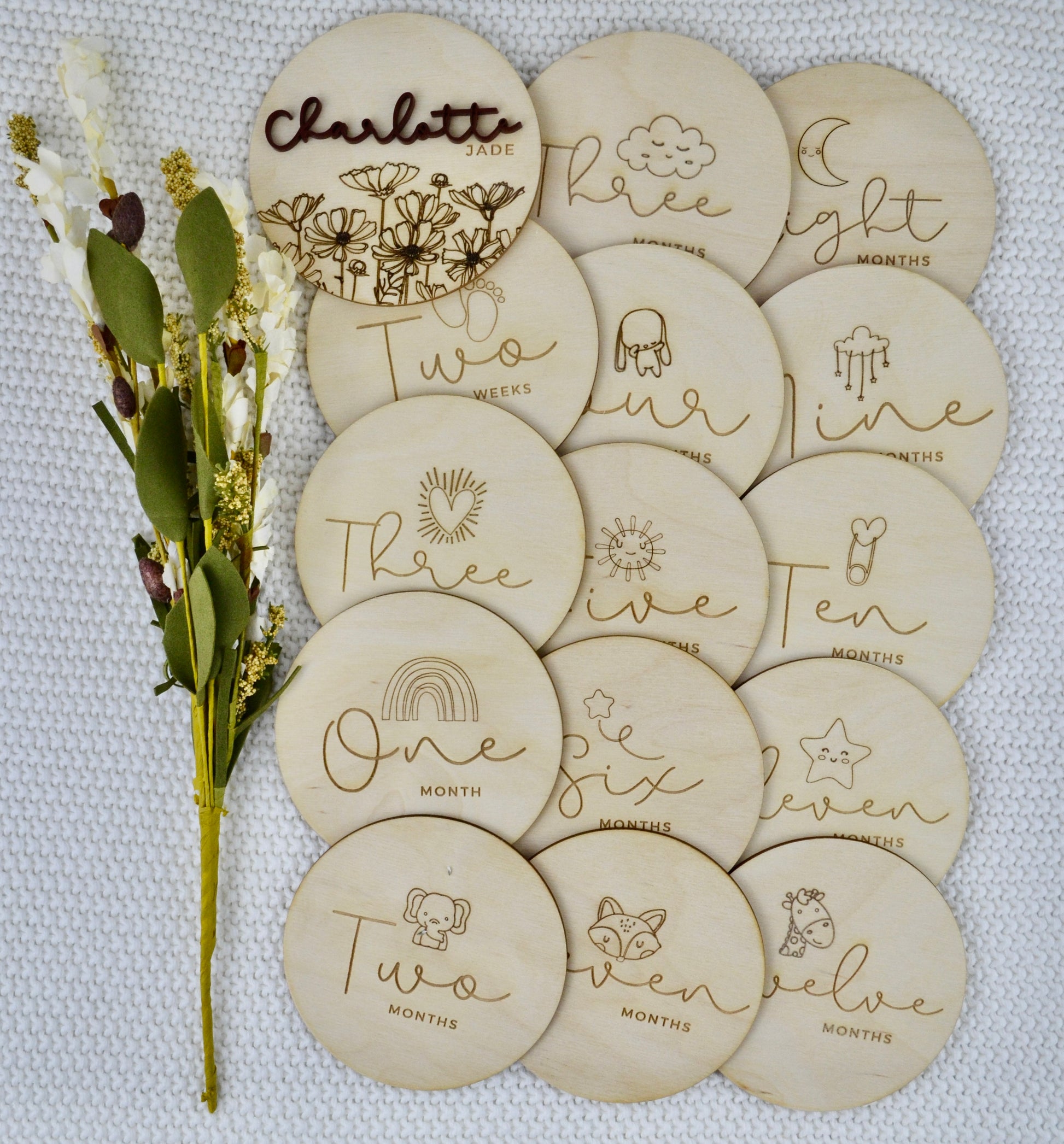 Wooden Monthly Baby Milestone Cards | Baby Shower Gift | Engraved Wood Discs | Modern Baby Photo Props
